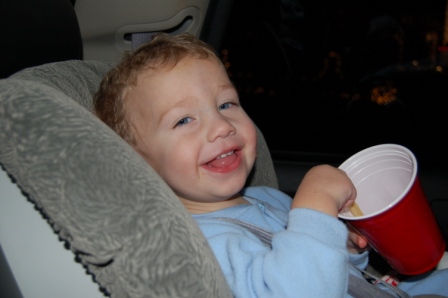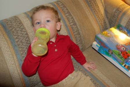 Luca playing trains by Aunt Angela and taking a ba-ba break