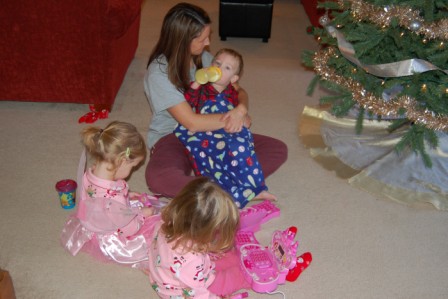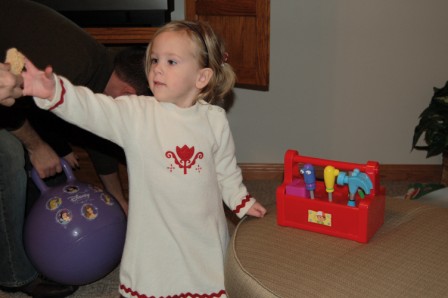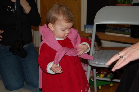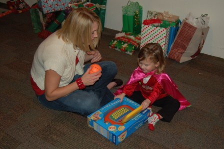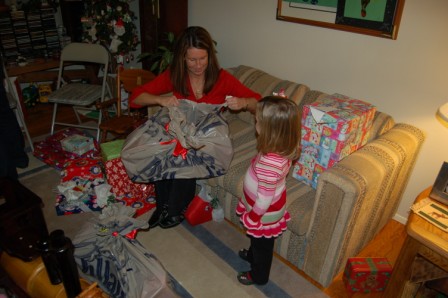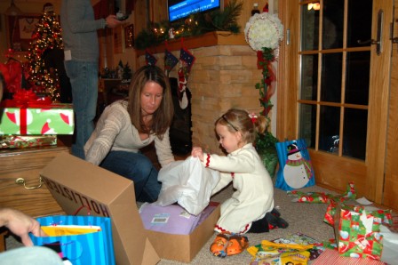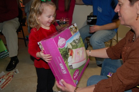 Ella helping open Mommy's present, a pink Ipod