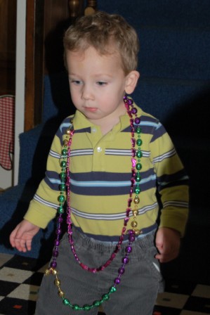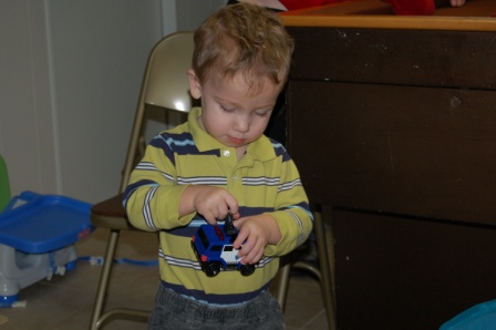 He was busy playing with the police car and wearing beads