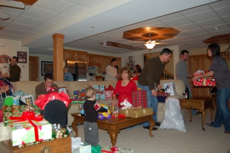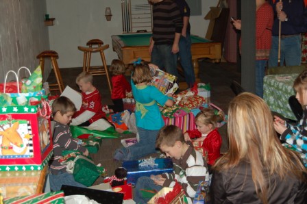 The kids opening presents and the adults watching