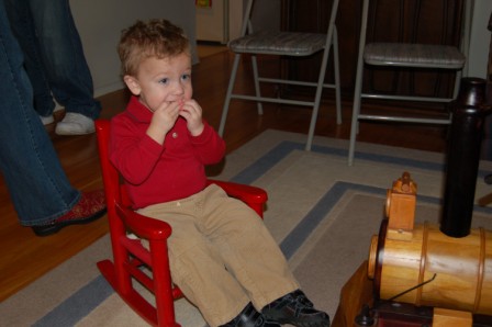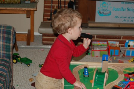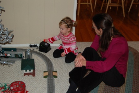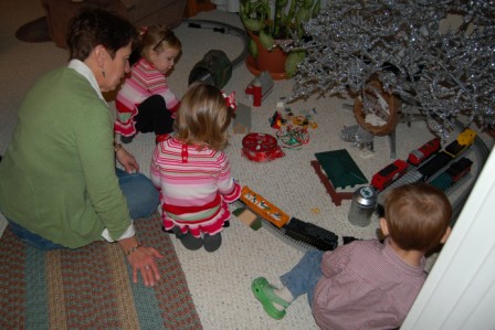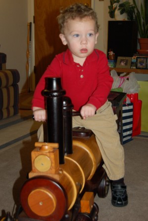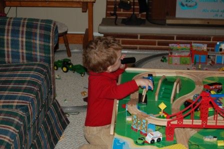 Lukey riding the big wooden train...Perry, Ella, Drew, and Grandma playing with the electric train