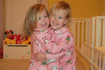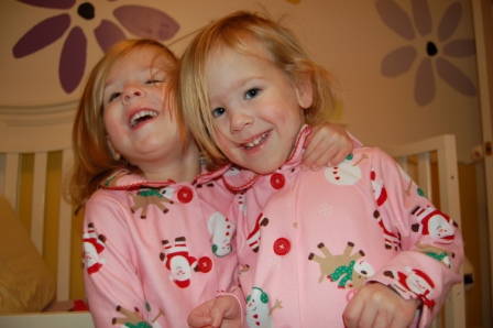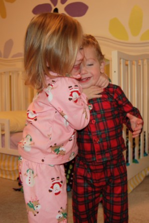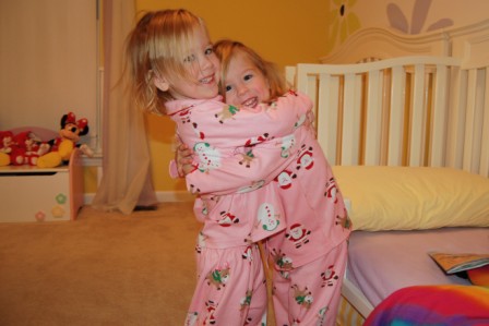 A little sisterly love to show off our new jammies that St Nick brought us