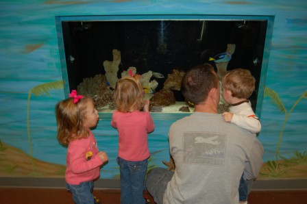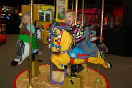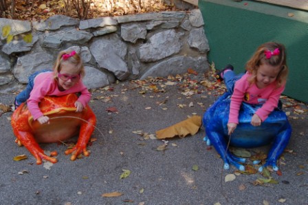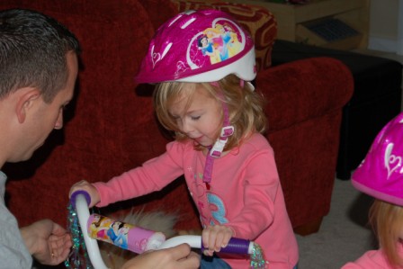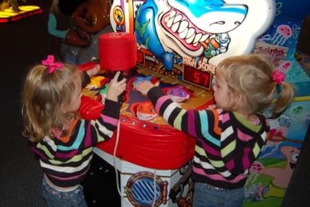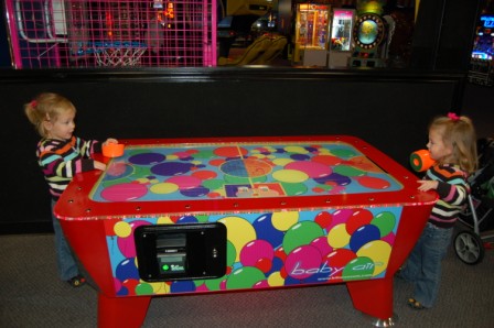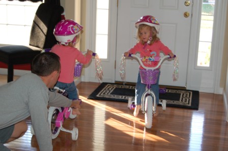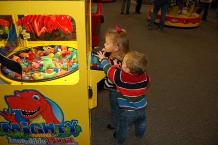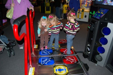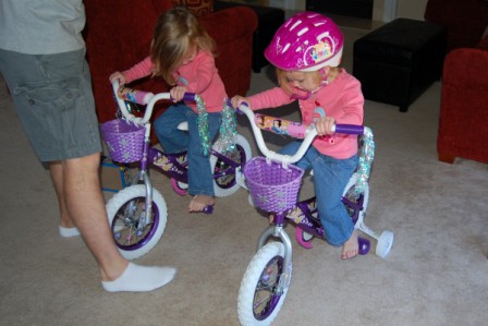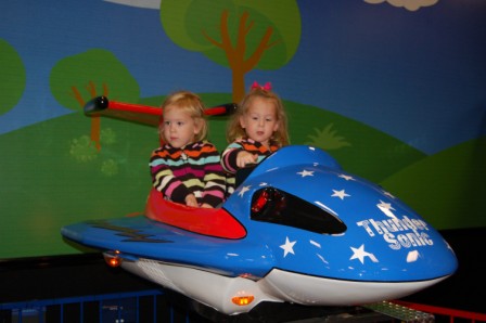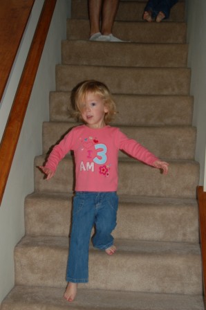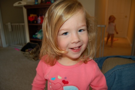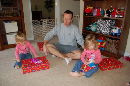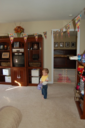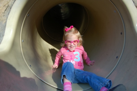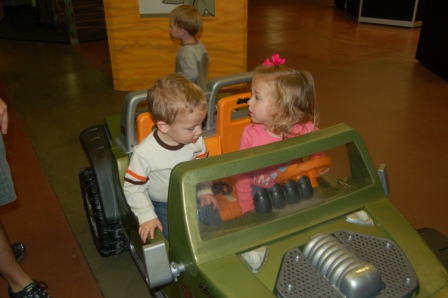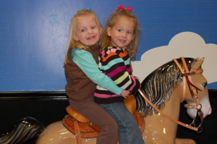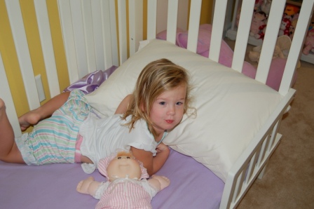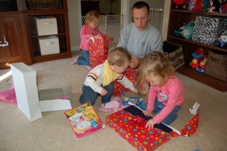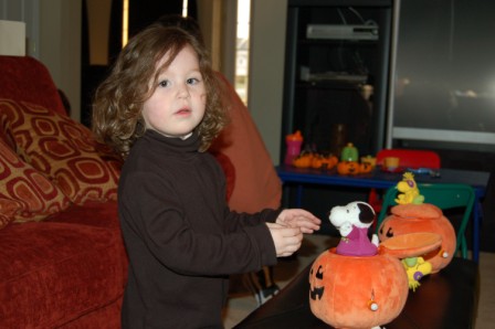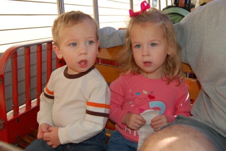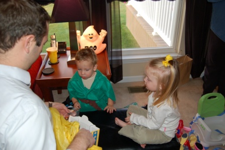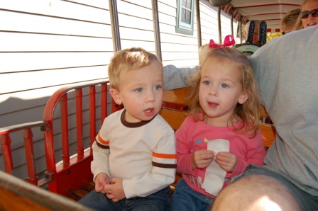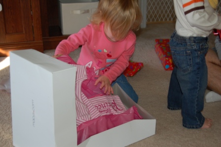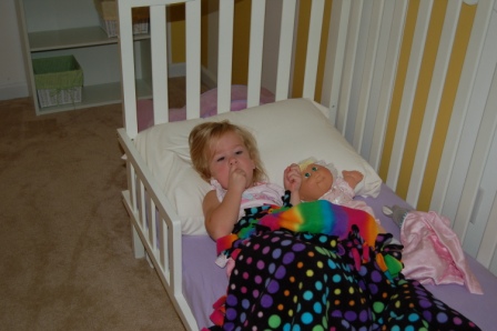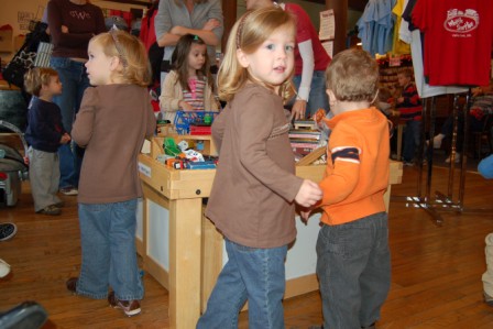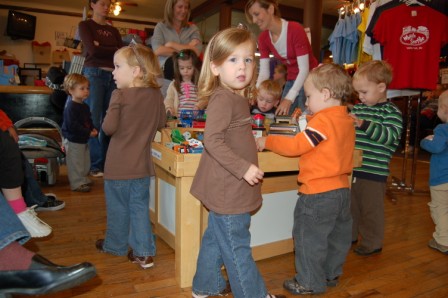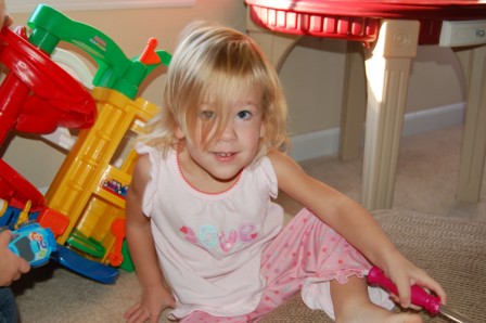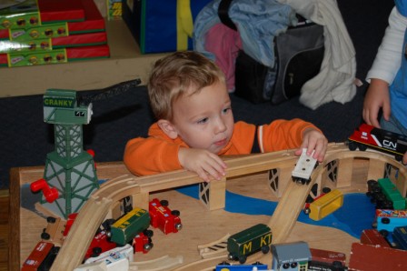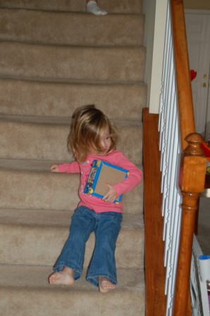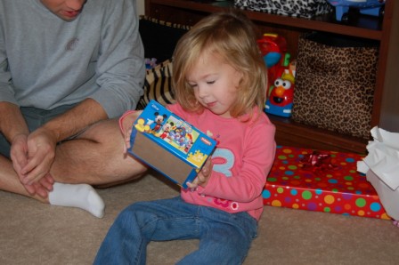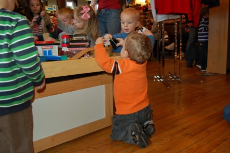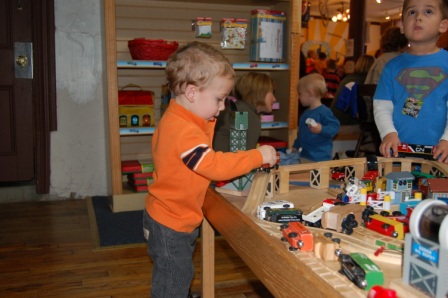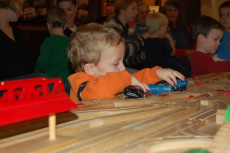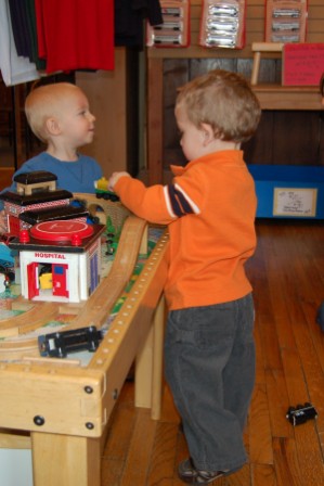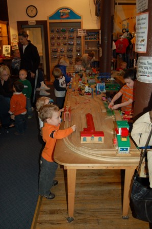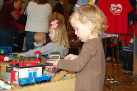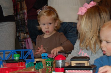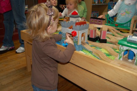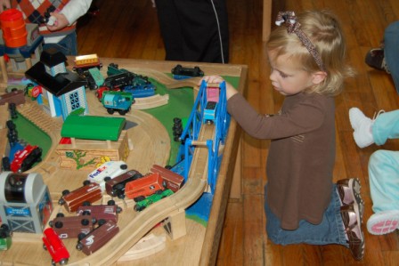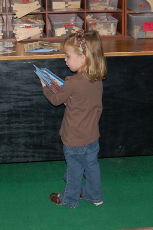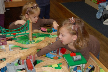 Ella got bored and went to rearrange the Thomas catalogs...both girls playing trains