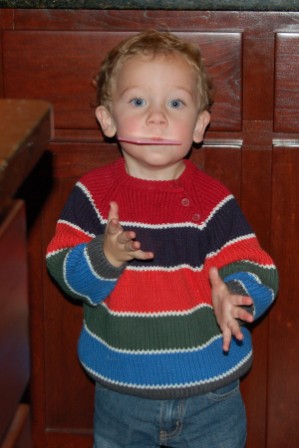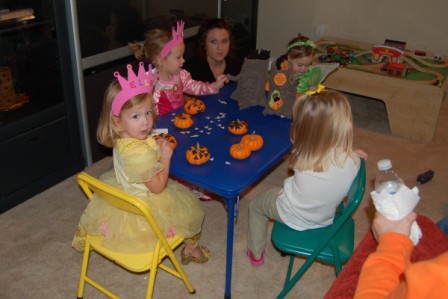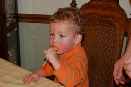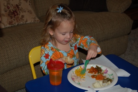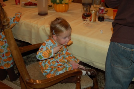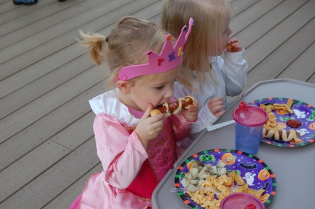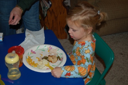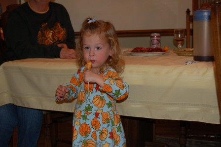 Eating dinner...Perry ate her mummy dog like corn on the cob