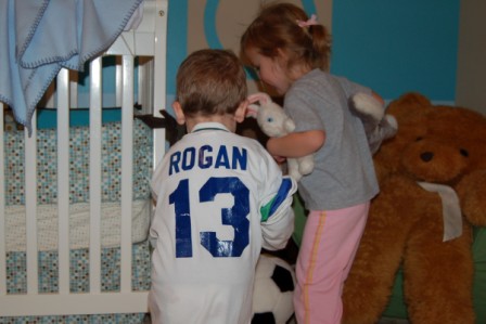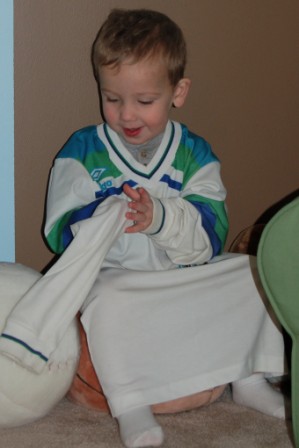 Trying on Daddy's old soccer shirt