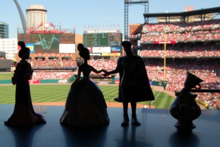 Mulan, Princess Tiana, Prince Naveen, and Mrs Potts at the game