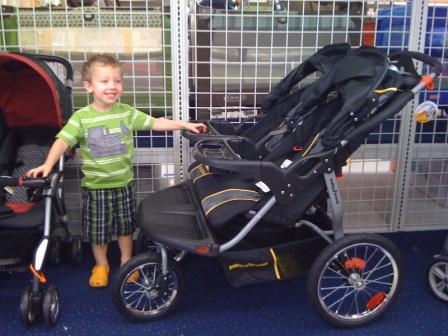 Luca standing by the stroller that Mommy covets