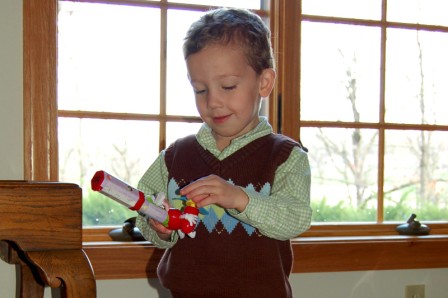 Luca amusing himself with some old style Lego people