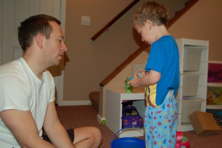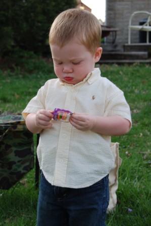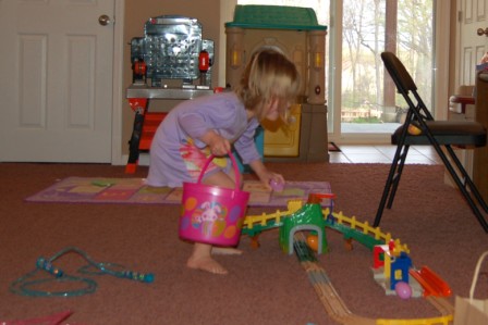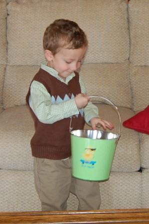 Someone snuck downstairs before everyone else and hunted some eggs and got into his basket
