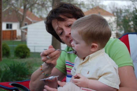 Grandma Deb feeding Noel some pudding...Papa Steve trying to feed Ella some pudding