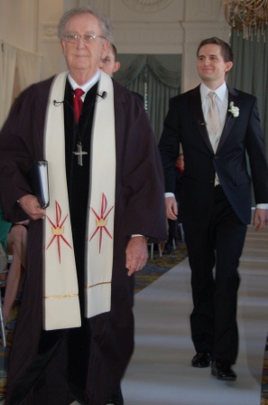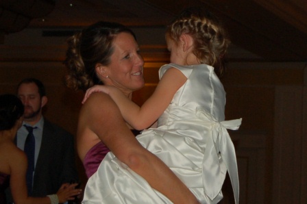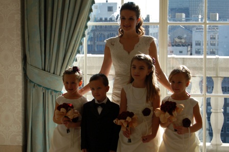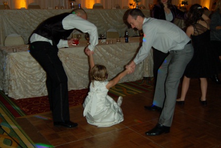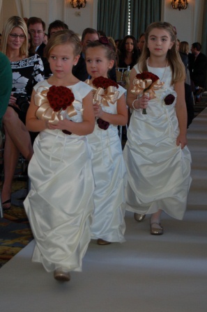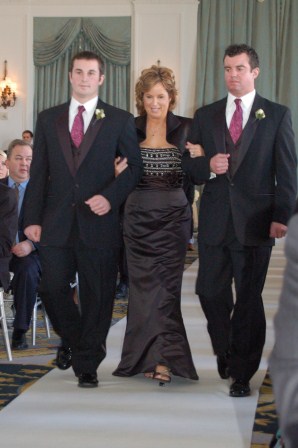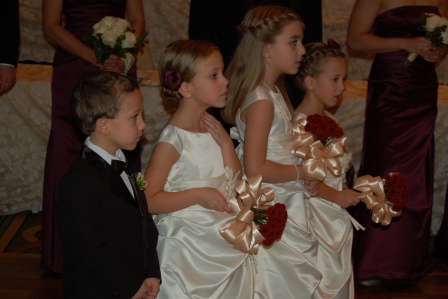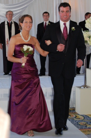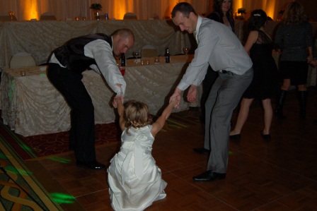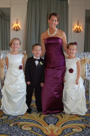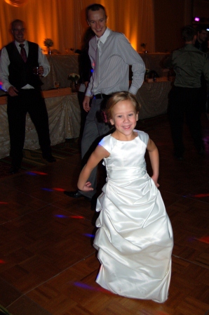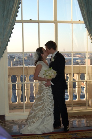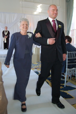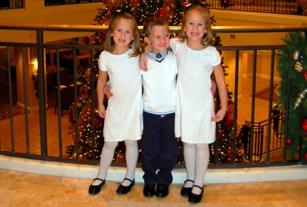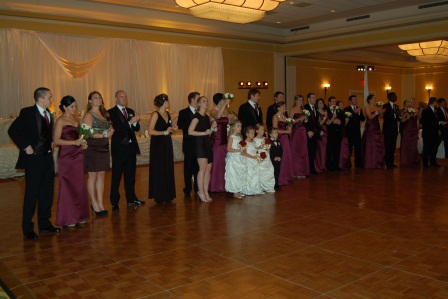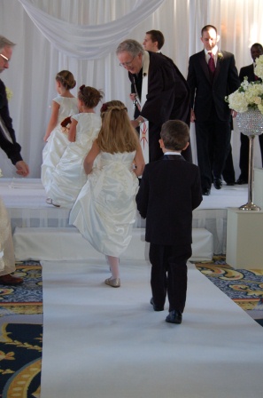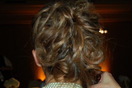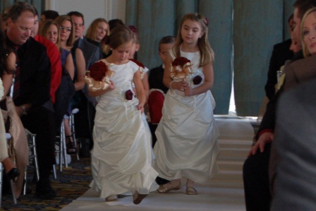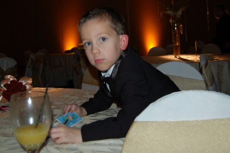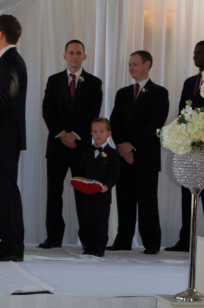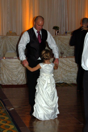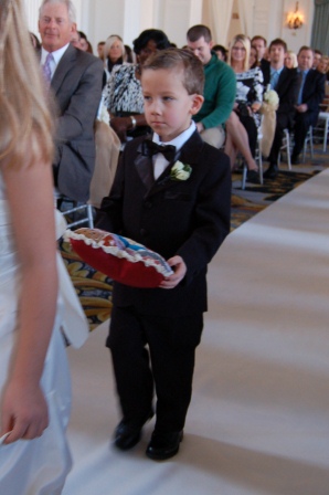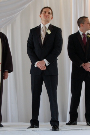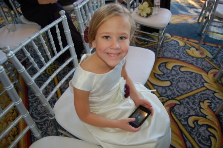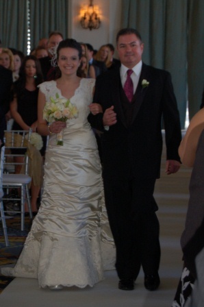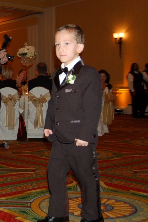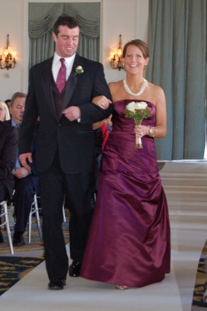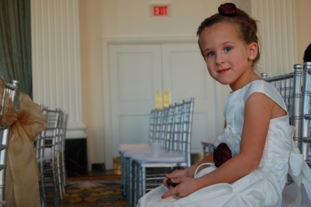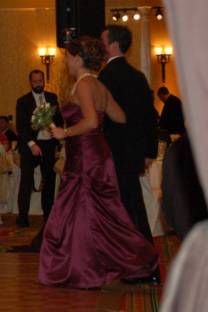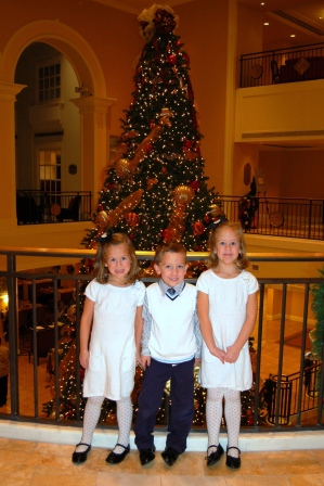 Going to the rehearsal dinner, posing with the big tree in the hotel lobby
