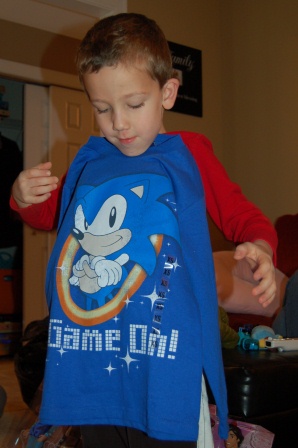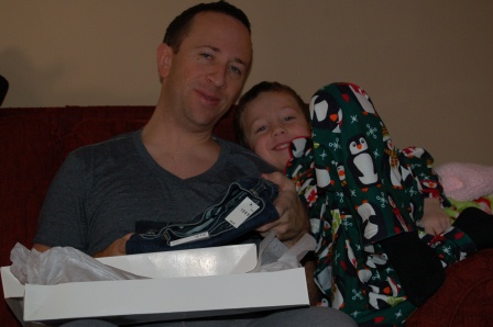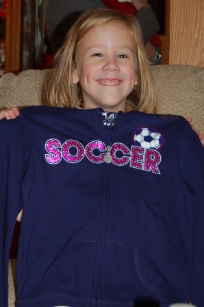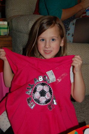 Ella opening presents with Stu...It's All About Goals sweatshirt