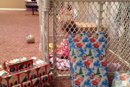 Cute little baby, sitting in her baby jail, sucking on her paci, while Mommy wraps presents