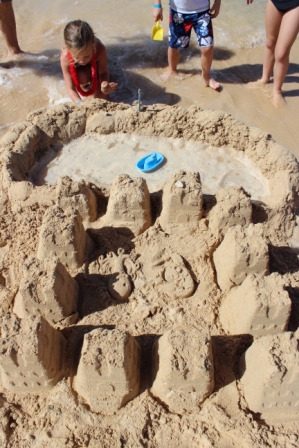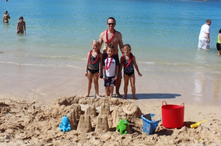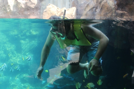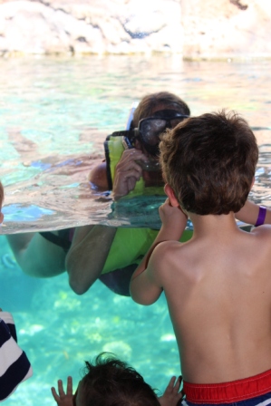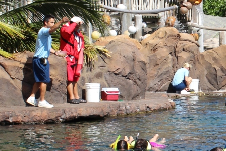 With a Stitch statue...Luca with the ocean in the background (and some construction)