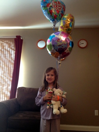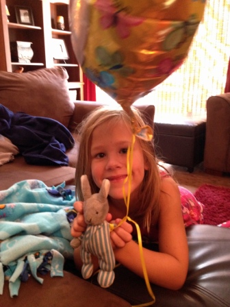 Hop Hop and a balloon...Ella with her 2 new animals from the Grandmas
