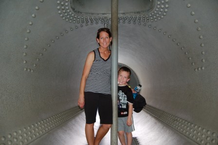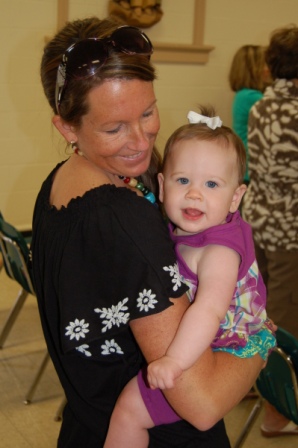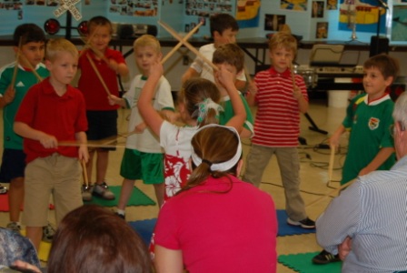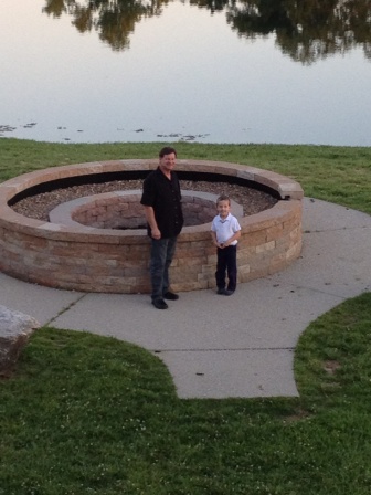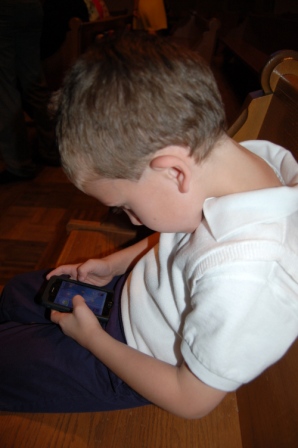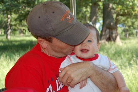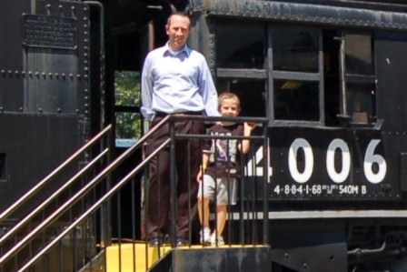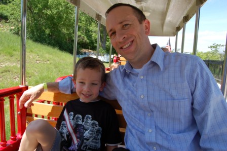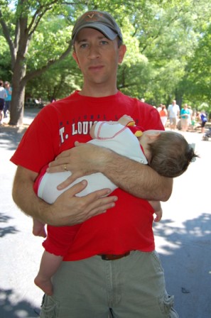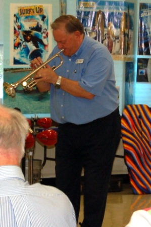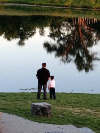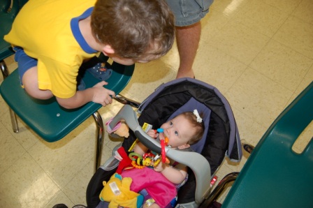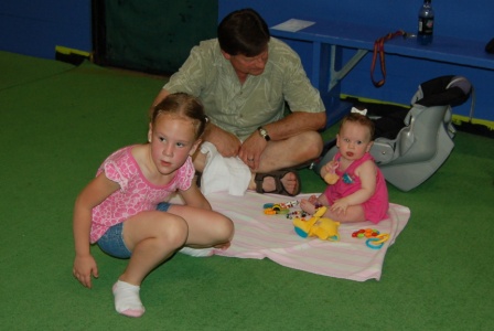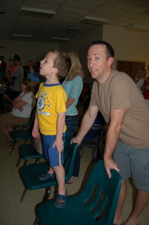 Daddy and Luca trying to see...Mr Wynn on the trumpet