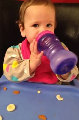 Big girl with big girl shoes on and drinking a big girl sippy