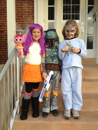 Ella as a Lalaloopsy, Luca as Boba Fett, Perry as Hop Hop, and Carly as a fairy