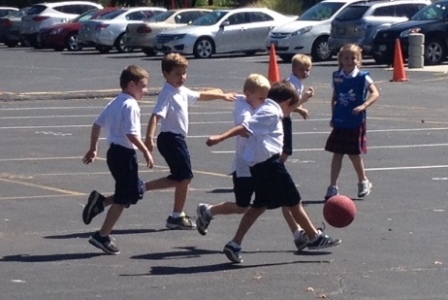 Perry playing soccer with all the boys at recess