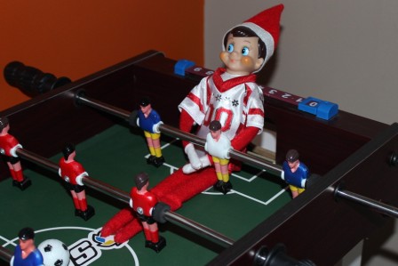 Elfie knew the girls had a soccer game so he put his jersey on and played goalie