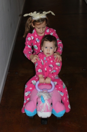 Ella helping Carly ride her new unicorn