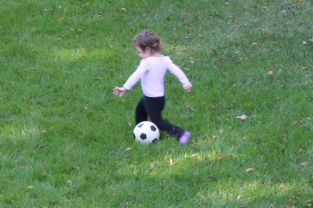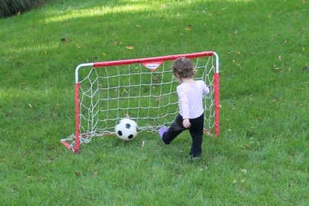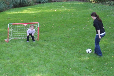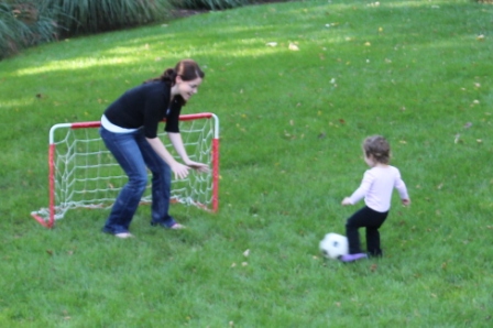 Carly playing soccer with Rachel