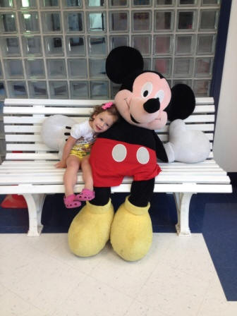 A huge stuffed Mickey in the lobby of the school where Luca did Science Camp