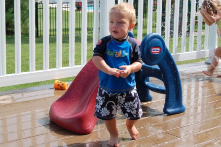 Perry on the slide (modeling one of our hand me down bikinis from Riley)