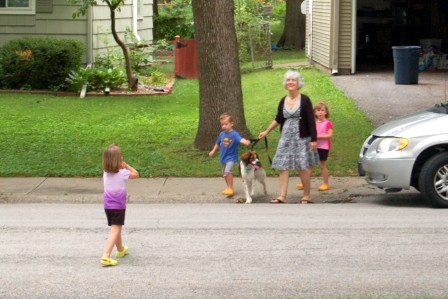 Aunt Anne taking the kids and Luke (the dog) for a walk