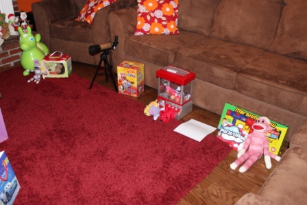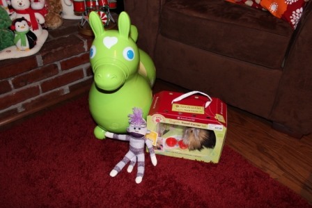 (Rody, sock monkey, and Bitty Baby pet for Carly...telescope, helicopter, and